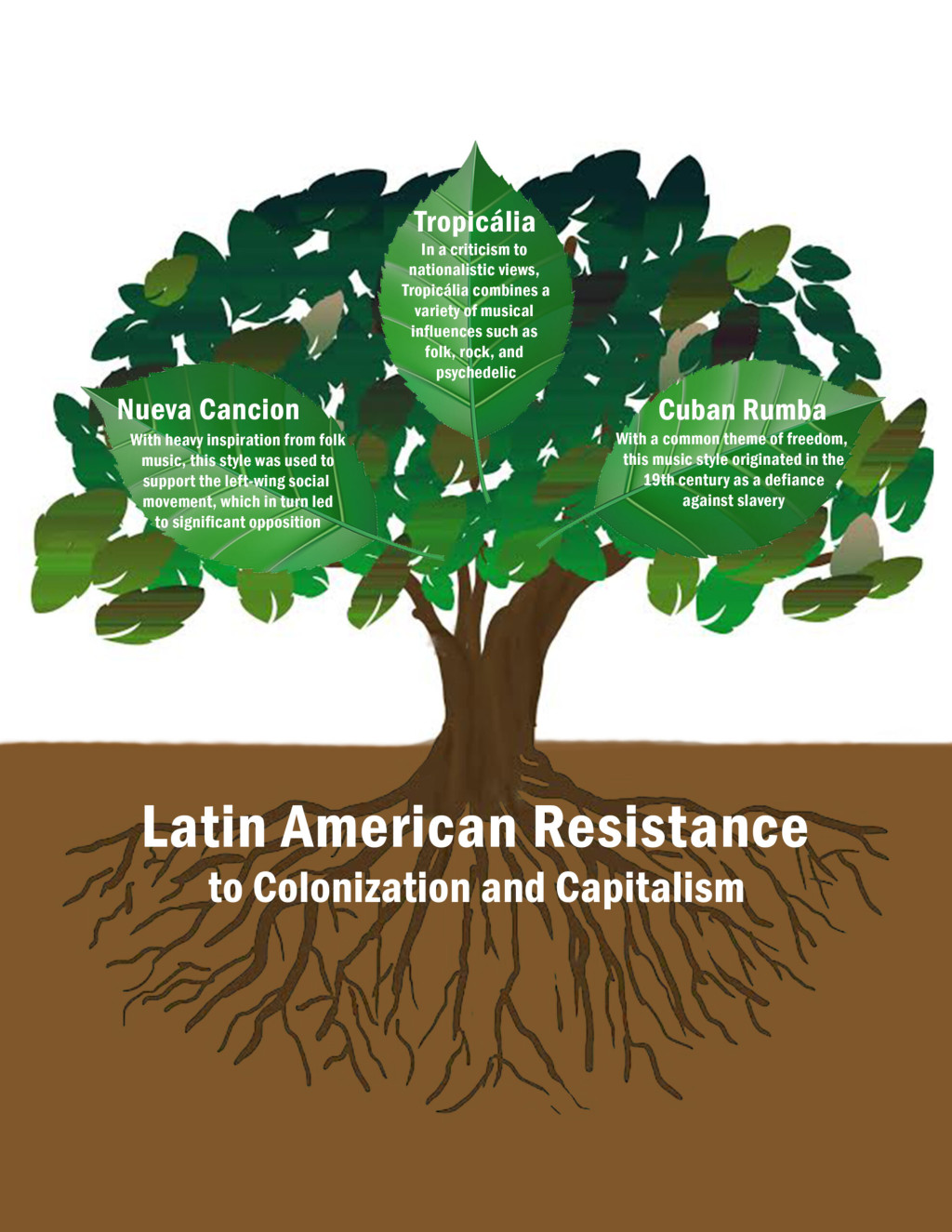 Latin America’s vibrant history includes stories of horrific oppression, then powerful resistance. Thus, many and varied musical styles have developed over time as a form of cultural defiance. Three particular styles created in resistance are Cuban rumba, nueva canción of Chile and Argentina, and Tropicália from Brazil. These genres have gone on to influence modern music in significant ways.