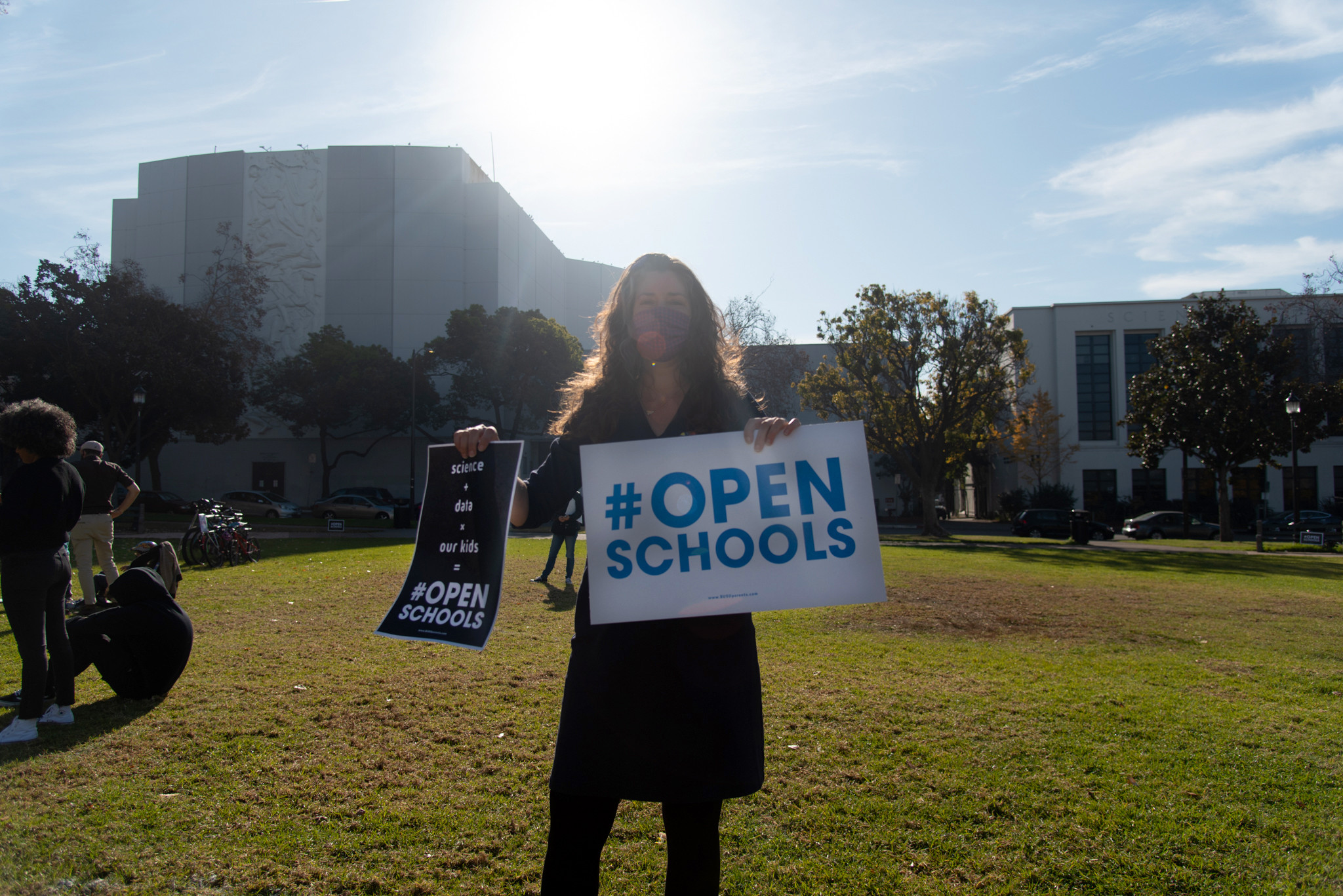 Several scheduled speakers appeared as well, including school board member Laura Babitt and Dr. Jeanne Noble, director of the COVID-19 response team at the University of California, San Francisco (UCSF). Babitt said, “As your elected official, please know that I not only hear you, but I firmly believe we can do something about it. We can safely reopen our schools.” Noble made her points by referencing data from Europe. “In Spain, they found that [COVID-19] transmission in the communities decreased when they opened their schools, possibly because kids were then well-supervised, and masked.” In New York, she said, “the number of people infected with [COVID-19] in the school system was far less than the surrounding New York communities.” And in Marin County, “there has been exactly two cases of campus-based [COVID-19] transmission. That is two cases of [COVID-19] that would not have happened if those forty thousand students and five thousand teachers had not congregated on campus.” Finally, Noble asked the crowd, “Is that worth the risk?” The crowd responded with affirmative yelling and clapping.