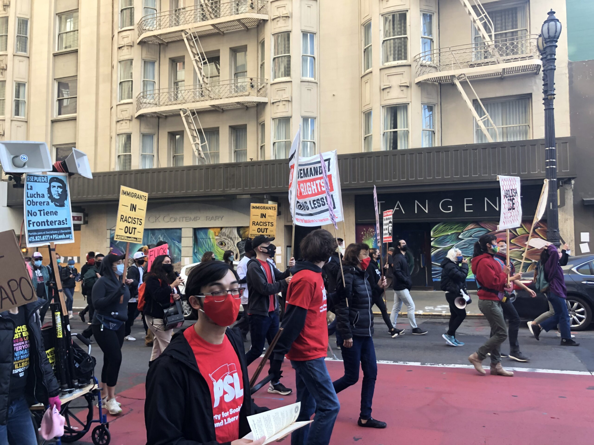 About halfway through, the protestors stopped at the corner of Taylor and Turk Street, where the Taylor Street Parolee Services Center is located. The building is a halfway house for inmates and parolees exiting the prison system and preparing to enter back into normal life. The facility is owned by GEO Group, a real estate trust company that also runs seven immigration detention facilities in California.