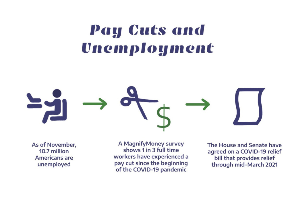 As high school students, Redmond, Rongstock-Kramer, and Burns were working to save for the future, which does place them in a different position from those working to support themselves or their families. Despite Burns’ awareness of COVID-19’s effect on homelessness, the fear of eviction or being able to provide for herself isn’t a major issue for her. However, finding a way to pay rent and put food on the table is a very real problem that many individuals and families dealing with unemployment have to face. Because of this, the government has finally moved forward with a coronavirus relief bill partially focusing on benefits for the unemployed.